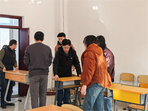 在志愿服务中,党员教师们分工协作、高效推进。先对K407教室进行分类清场,将新桌椅集中摆放至指定区域,同时规整旧桌椅;随后按预设路线分批转运新桌椅,搬运教师轻拿轻放保护财物,引导教师在关键节点疏导路线,避免拥堵;最终在K409教室按教学标准规范布设新桌椅,同步清理两处教室杂物与灰尘,确保两地均达到教学使用标准。
